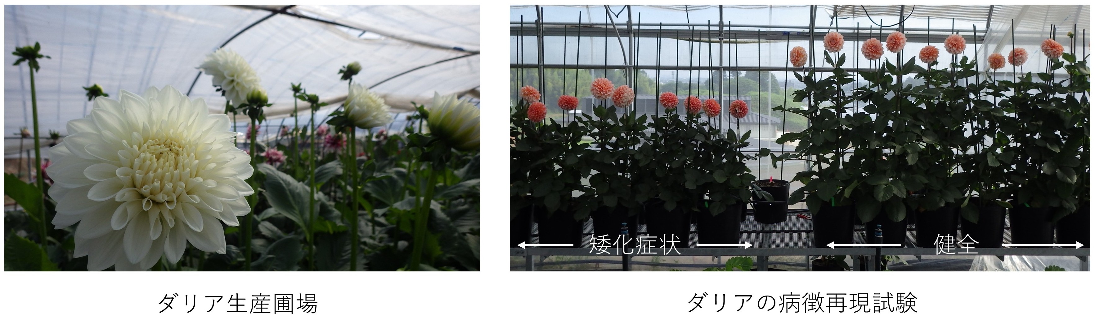 3.ダリア矮化病:原因不明の矮化症状の原因が、ウイロイド感染が原因であることを明らかにし、対策を構築した (Asano et al. 2022)